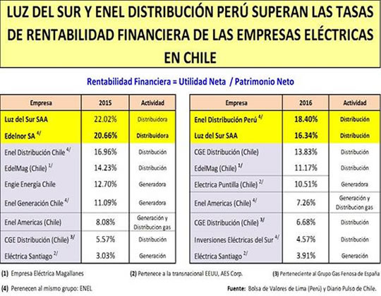 Si se adopta como indicador de rentabilidad eléctrica, la tasa de rentabilidad financiera definida como la relación existente entre la utilidad neta entre el patrimonio, cuya cuenta principal es el capital suscrito y pagado, podemos estimar las rentabilidades en ambos países, tal como se expone en el cuadro “Luz del Sur y Enel Distribución Perú superan las Tasas de Rentabilidad Financiera de las Empresas Eléctricas en Chile 2015/ 2016”