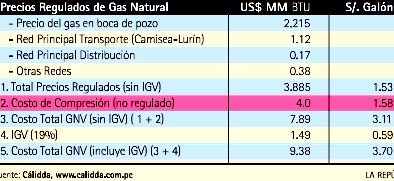 Pero el costo de compresión en el grifo (gasocentro) no es regulado y Cálidda lo calculó en US$ 4/MMBTU o en S/. 1.58 por galón. Increíble: el costo de compresión en el gasocentro es superior al precio en boca de pozo (en la selva de Camisea) más todos los costos de transporte. Según los expertos, este costo de compresión es exagerado.