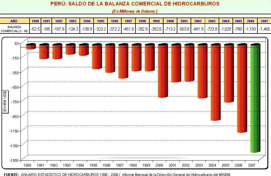 Si bien, también exportamos petróleo pesado y residuales industriales las importaciones son mayores tanto en términos de volúmenes más de 50 millones de barriles en el 2007, como de valor, de allí que se puede observar el Saldo de la Balanza Comercial (X-M), es decir las diferencias entre exportaciones e importaciones van en aumento, en 2007 sumaba los 1,465 millones de dólares, superando el déficit del 2006 que fue 1,193 millones. Es decir, el déficit se incrementó en 272 millones a pesar del extraordinario crecimiento del consumo interno del gas de Camisea.