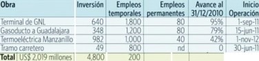 México lo llama “Proyecto Integral Manzanillo”, pues tiene varios elementos: 1) el Terminal de GNL, que va a costar US$ 640 millones; 2) la repotenciación de las Centrales 1 y 2 de Manzanillo, que cambiarán diesel por gas y aumentarán las capacidad de generación de 300 a 700 MW por módulo, con una inversión de US$ 982 millones; 3) el gasoducto a Guadalajara, por US$ 348 millones, donde se construirán dos centrales eléctricas adicionales. Todo comienza a funcionar este año y en el 2012.