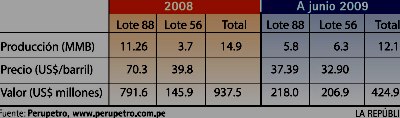 Pero este no es el caso. Los accionistas mayoritarios de Perú LNG se benefician de las utilidades del Lote 88, que en el 2008 fueron US$ 360 millones. También se benefician de las ventas de los líquidos del Gas Natural del Lote 56, que en el 2008 comenzó su producción, la que llegó a 3.7 millones de barriles (MMB), por un valor de US$ 146 millones. En el I Semestre del 2009, el Lote 56 ha producido 6.3 MMB (más que el Lote 88, que produjo 5.8 MMB) por un valor de US$ 207 millones.