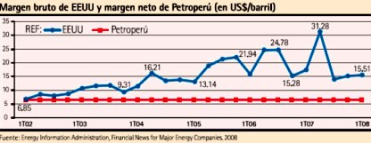 Para obtener el margen neto, al margen bruto hay que descontarle el costo de la refinación. La Memoria de Petroperú nos dice que su margen neto de refinación fue US$ 5.3 y US$ 6.8/barril en el 2004 y 2005 (ese es el costo que hemos puesto en el gráfico, para todo el periodo). Según las Memorias de Repsol, en el 2004 su margen neto, para sus operaciones en todo el mundo, fue US$ 5.7/barril y en el 2007 fue US$ 7.2/barril.