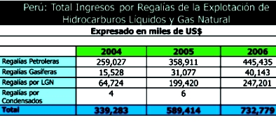 Por tanto, en el 2006 por concepto de regalías de hidrocarburos (US$ 733 millones) e impuesto a la renta (S/ 970 millones de nuevos soles) el Fisco ha captado más de 3,169 millones de nuevos soles. Estas cifras superan los valores recaudados en el 2005 por concepto de regalías (US$ 589 millones) y por impuesto a la renta pagado por las empresas de hidrocarburos ( S/ 431 millones), que en conjunto totalizan S/ 2,368 millones de nuevos soles.