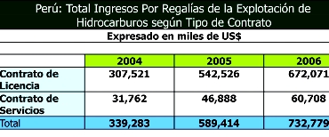 En el segundo cuadro se presenta las regalías según tipo de contrato, en los llamados contratos de Licencia las empresas para acceder al uso y usufructo del crudo abonan una regalía al Estado, mientras en los contratos de Servicios el Estado paga al contratista una retribución que puede ser en especie o en efectivo. Por los valores es claro que los contratos de Licencia son los más importantes, y en los contratos de Servicios la empresa más importante es PetroTech que opera en el Zócalo Continental, seguida por Graña y Montero y Unipetro que operan en Talara. Todas las empresas con contratos de Servicios abonaron en el 2006 valores equivalentes a 61 millones de dólares frente a los 672 millones que pagan todas las empresas bajo contrato de Licencias.