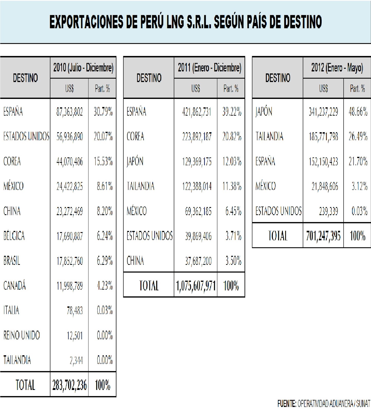 El cuadro “Exportaciones de Perú LNG S.R.L. según país de Destino”, con la fuente de Aduanas se expone las exportaciones de Repsol a nombre del Consorcio Perú LNG S.R.L. en el segundo semestre del 2010, durante el 2011 y en los primeros cinco meses del 2012, donde el valor de las exportaciones eran de 284 millones de dólares, 1,075 millones y 701 millones respectivamente como se puede observar.