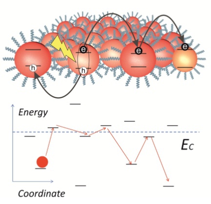 Los nanocristales semiconductores (puntos cuánticos) es un material nanohíbrido creado por los científicos de la MEPhI que está cubiertos con ligandos, moléculas orgánicas que impiden que los puntos cuánticos se peguen. Por eso los puntos cuánticos conservan sus ‘características individuales’ formando un medio continuo, lo que hace posible el paso de la corriente eléctrica. Esta conductividad se caracteriza por saltos electrónicos, como semiconductores orgánicos, donde los saltos de los electrones no se producen entre moléculas orgánicas, sino entre los puntos cuánticos.