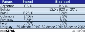 Varios países han dictado ya una serie de dispositivos legales para reglamentar las mezclas obligatorias de biocombustibles en sus mercados internos. Entre ellos están Argentina, Brasil (país pionero, pues el uso del etanol comenzó hace más de 20 años), Colombia, Paraguay, Perú y Uruguay. En Bolivia, la mezcla ha sido postergada por el actual gobierno, que tiene una posición contraria a su uso.