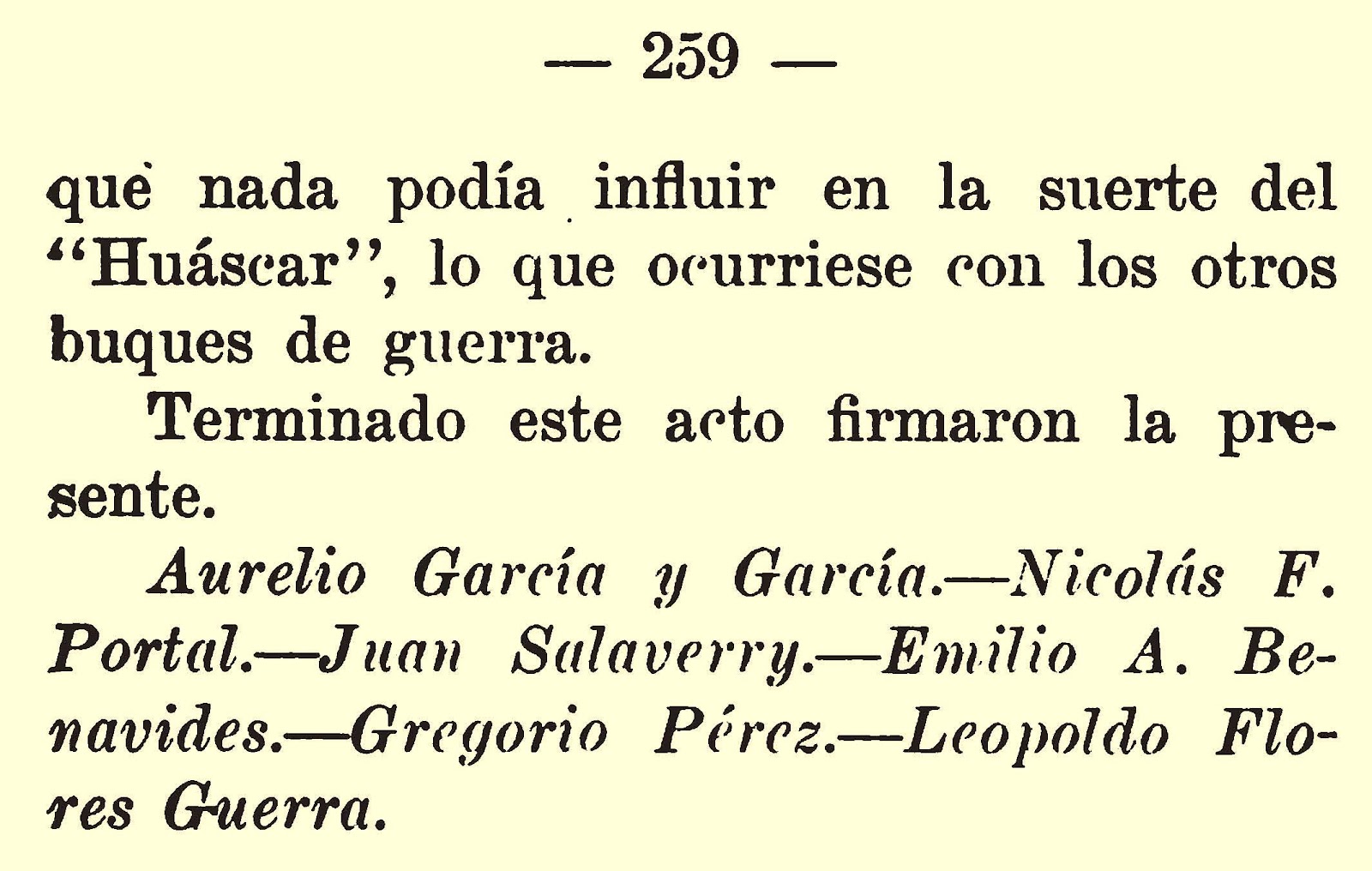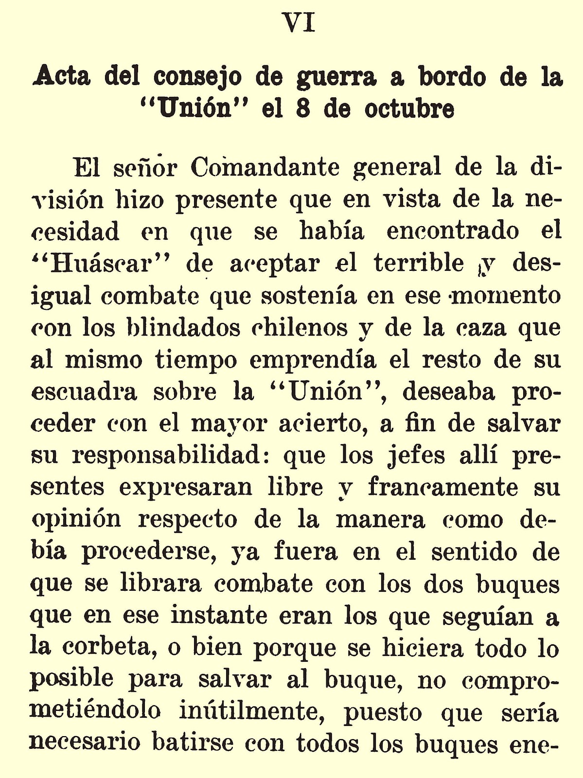 Acta del Consejo de Guerra realizado el 8 de octubre de 1879 a bordo de la corbeta “Unión”, tras haber abandonado a Miguel Grau y al monitor “Huáscar” frente a los blindados chilenos “Cochrane” y “Blanco Encalada” y demás naves de la escuadra enemiga (Del Campo 257-259). Con este documento, Aurelio García y García, comandante de la Segunda División Naval, a bordo de la “Unión”, intentó justificar su fuga del combate de Angamos.
