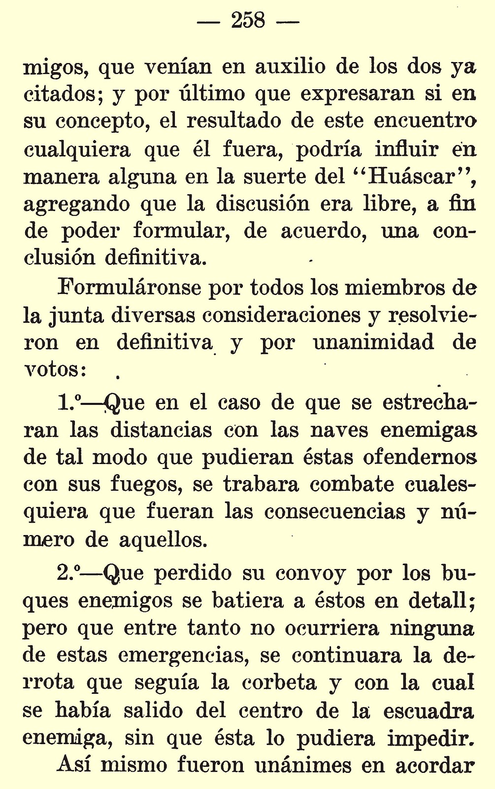 8. Según el primer acuerdo del Consejo de Guerra, en caso que las naves enemigas pudiesen “ofender con sus fuegos” a la Unión se trabaría combate con ellas, “cualesquiera que fueran las consecuencias y número de aquellas”.