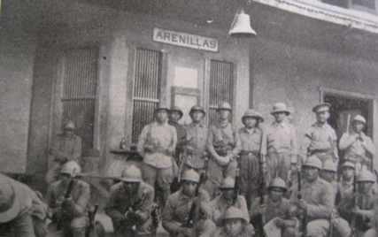 Estación del ferrocarril de Arenillas con tropas peruanas