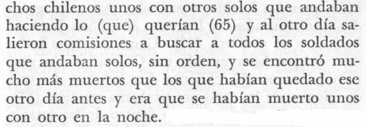 Finalmente, el cabo Gutiérrez registró las reyertas entre la soldadesca chilena que permaneció en Chorrillos. Escribió en la Crónica que en esos enfrentamientos murieron “bastantes chilenos”: “En Chorrillos se mataron muchos chilenos unos con otros solos que andaban haciendo lo (que) querían y al otro día salieron comisiones a buscar a todos los soldados que andaban solos, sin orden, y se encontró mucho más muertos que los que habían quedado ese otro día antes y era que se habían muerto unos con otro en la noche”.