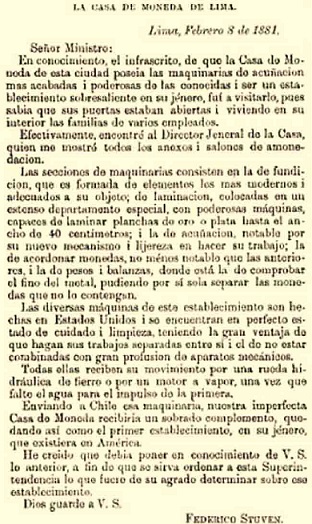 En el siguiente informe preparado por Federico Stuven Olmos, el lector podrá apreciar la sangre fría del chileno para apoderarse mediante el robo de propiedad que le es ajena. Reconoce el ladrón del sur que la Casa de la Moneda de Lima posee la maquinaria de amonedación más moderna, poderosa, rápida y adecuada, manteniéndose en perfecto estado de cuidado y limpieza. Stuven sugiere transportar las maquinarias peruanas a Chile para hacer de la imperfecta Casa de la Moneda de ese país el primer establecimiento en su género de América.