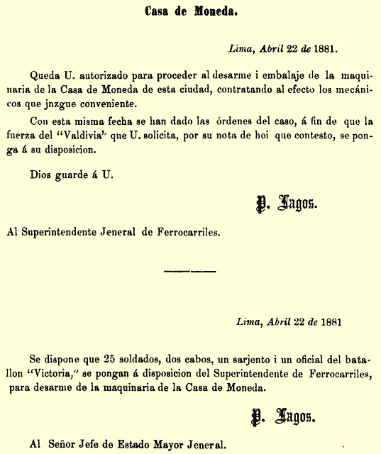 Decretos del atracador chileno Pedro Lagos Marchant autorizando el robo de la maquinaria de la Casa de la Moneda de Lima. Destino final de los equipos hurtados: Casa de la Moneda de Santiago (Lynch 1882, CLXXIII).