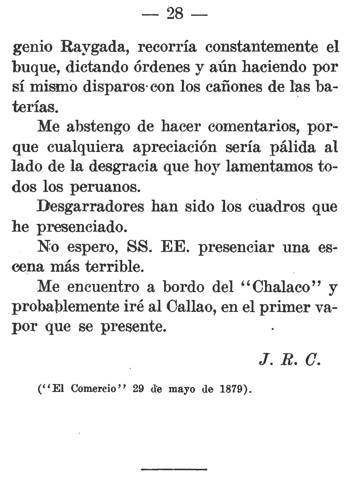 Corresponsal de «El Comercio» de Lima, José Rodolfo del Campo, relata el anunciado desastre del 21 de mayo de 1879.