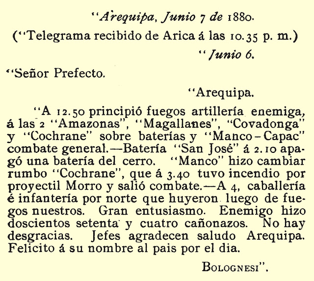A 12.50 principió fuegos artillería enemiga, a las 2 “Amazonas”, “Magallanes”, “Covadonga” y “Cochrane” sobre baterías y “Manco Cápac” combate general.– Batería “San José” a 2:10 apagó una batería del cerro. “Manco” hizo cambiar rumbo “Cochrane”, que a 3:40 tuvo incendio por proyectil Morro y salió combate.– A 4, caballería e infantería por norte que huyeron luego de fuegos nuestros. Gran entusiasmo. Enemigo hizo doscientos setenta y cuatro cañonazos. No hay desgracias. Jefes agradecen saludo Arequipa. Felicito a su nombre al país por el día.