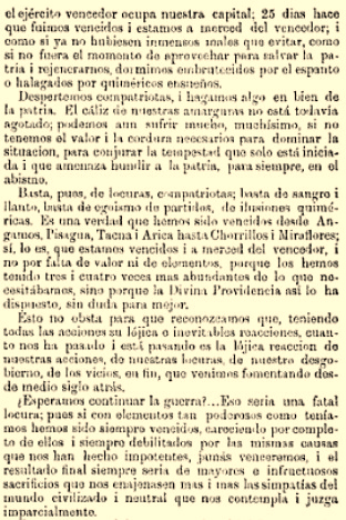 Basta, pues, de locuras, compatriotas: basta de sangre y llanto, basta de egoísmo de partidos, de ilusiones quiméricas. Es una verdad que hemos sido vencidos desde Angamos, Pisagua, Tacna y Arica hasta Chorrillos y Miraflores; sí, lo es, que estamos vencidos y a merced del vencedor, y no por falta de valor ni de elementos, porque los hemos tenido tres y cuatro veces más abundantes de lo que necesitábamos sino porque la Divina Providencia así lo ha dispuesto, sin duda para mejor.