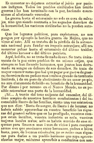 ¿Esperamos continuar la Guerra? Eso sería una fatal locura; pues si con elementos tan poderosos como teníamos hemos sido siempre vencidos, careciendo por completo de ellos y siempre debilitados por las mismas causas que nos han hecho impotentes, jamás venceremos, y el resultado final siempre sería de mayores e infructuosos sacrificios que nos enajenasen más y más las simpatías del mundo civilizado y neutral que nos contempla y juzga imparcialmente.