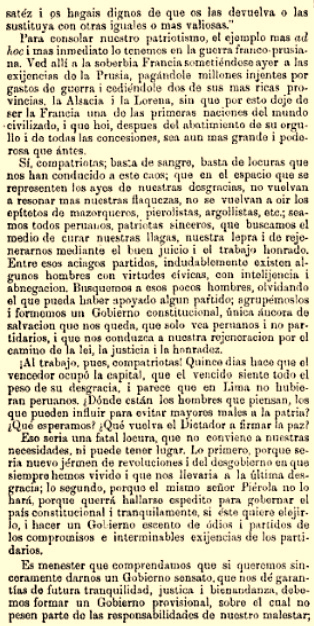 Sí, compatriotas; basta de sangre, basta de locuras que nos han conducido a este caos; que en el espacio que se representen los ayes de nuestras desgracias, no vuelvan a resonar más nuestras flaquezas, no se vuelvan a oír los epítetos de mazorqueros, pierolistas, argollistas, etc.; seamos todos peruanos, patriotas sinceros, que buscamos el medio de curar nuestras llagas, nuestra lepra y de regenerarnos mediante el buen juicio y el trabajo honrado. Entre esos aciagos partidos, indudablemente existen algunos hombres con virtudes cívicas, con inteligencia y abnegación. Busquemos a esos pocos hombres, olvidando el que pueda haber apoyado algún partido; agrupémoslos y formemos un Gobierno constitucional, única áncora de salvación que nos queda, que sólo vea peruanos y no partidarios, y que nos conduzca a nuestra regeneración por el camino de la ley, la justicia y la honradez.