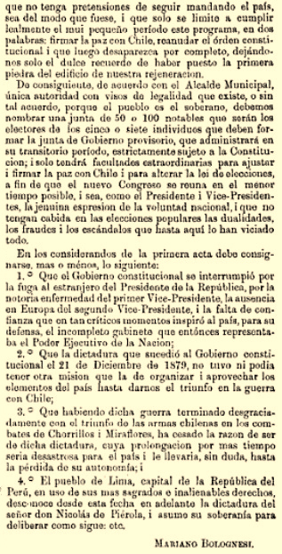 De consiguiente, de acuerdo con el Alcalde Municipal, única autoridad con visos de legalidad que existe, o sin tal acuerdo, porque el pueblo es el soberano, debemos nombrar una junta de cincuenta o cien notables que serán los electores de los cinco o siete individuos que deben formar la junta de Gobierno provisorio, que administrará en su transitorio periodo, estrictamente sujeto a la Constitución; y sólo tendrá facultades extraordinarias para ajustar y firmar la paz con Chile y para alterar la ley de elecciones, a fin de que el nuevo Congreso se reúna en el menor tiempo posible, y sea, como el presidente y vicepresidentes, la genuina expresión de la voluntad nacional, y que no tengan cabida en las elecciones populares las dualidades, los fraudes y los escándalos que hasta aquí lo han viciado todo.