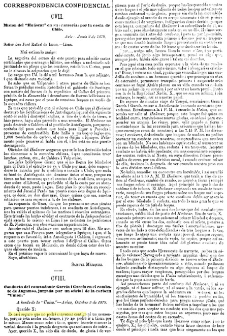 Carta de un oficial peruano de la «Unión» sobre el combate de Angamos y el comportamiento del comandante de la corbeta durante la misión conjunta de ésta con el «Huáscar».