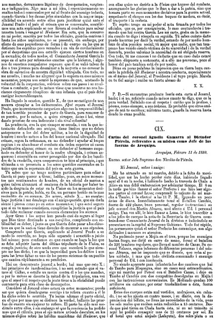 Tú sabes que no tengo motivos particulares para odiar a García ni para querer a Grau; hablan, pues, en estos momentos mis sentimientos de hombre, de un oficial de marina a quien tal vez alcanzará el anatema de la historia por haber tenido la desgracia de estar en la Unión en los momentos decisivos para la patria; habla, en fin, un peruano herido en lo más recóndito de su corazón. No acuso, sábelo X… no ensalzo; hago justicia y me desahogo con el amigo querido, que sin duda siente y piensa como yo en estos momentos; y que estoy seguro que si en tu mano consintiera, cumplirías la justicia que el país todo debe reclamar cuando conozca claramente los sucesos.
