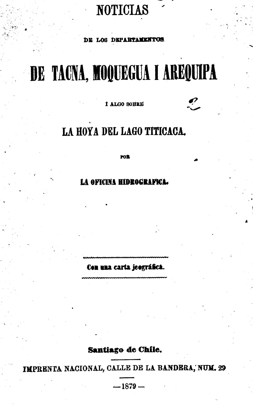 Portada del opúsculo “Noticias de los departamentos de Tacna, Moquegua y Arequipa y algo sobre la hoya del lago Titicaca (Con una carta geográfica)” de la Oficina Hidrográfica de Chile.