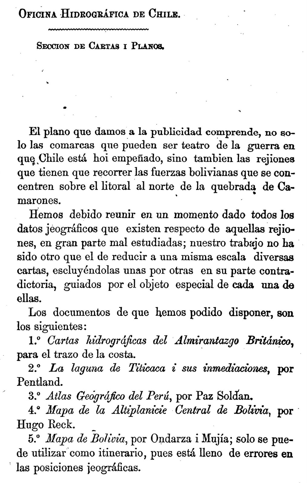Diego Barros Arana escribió al respecto en su “Historia de la Guerra del Pacífico (1879-1880)”: “La oficina hidrográfica [de Chile] preparó así excelentes mapas de aquellos lugares [las costas de Perú y Bolivia], y tratados descriptivos de la más perfecta claridad en que, a manera de los libros llamados ‘Guías del viajero’, se agrupaban noticias acerca de los accidentes del terreno, de sus recursos, de las dificultades que había que vencer y de los medios de subsanarlas. Los autores de esos escritos reunieron con este objeto todos los datos seguros que hallaban en los libros y en los documentos y los completaron con las noticias que podían suministrar los ingenieros que habían recorrido ese territorio. Los escritos y los mapas salidos de la oficina hidrográfica, que son ahora lo mejor que existe sobre la geografía de las costas del Perú, y de todo el territorio vecino al litoral, fueron impresos en un considerable número de ejemplares, y distribuidos en el ejército y la escuadra para que cada oficial, cada sargento que tuviese que desempeñar alguna comisión, conociera de antemano y con bastante exactitud las condiciones del terreno que tenía que recorrer. De aquí resultó más adelante que el ejército chileno conocía el país invadido mejor aún que los soldados que lo defendían.”