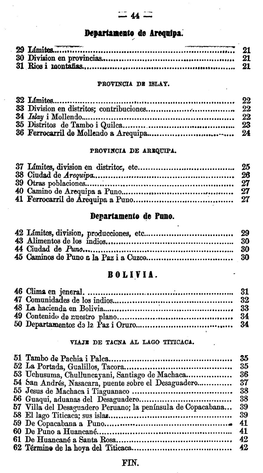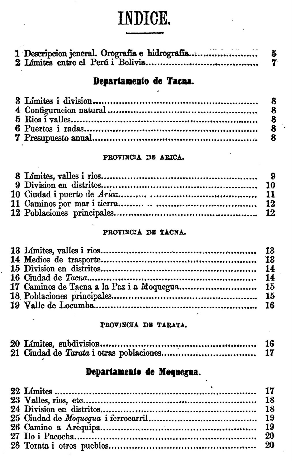 Contenido pormenorizado de las “Noticias de los departamentos de Tacna, Moquegua y Arequipa y algo sobre la hoya del lago Titicaca.” Puede apreciarse que se hace una descripción de los departamentos de Moquegua y Tacna. En este último caso, la información se presenta detallada para cada una de sus provincias (Arica, Tacna y Tarata).