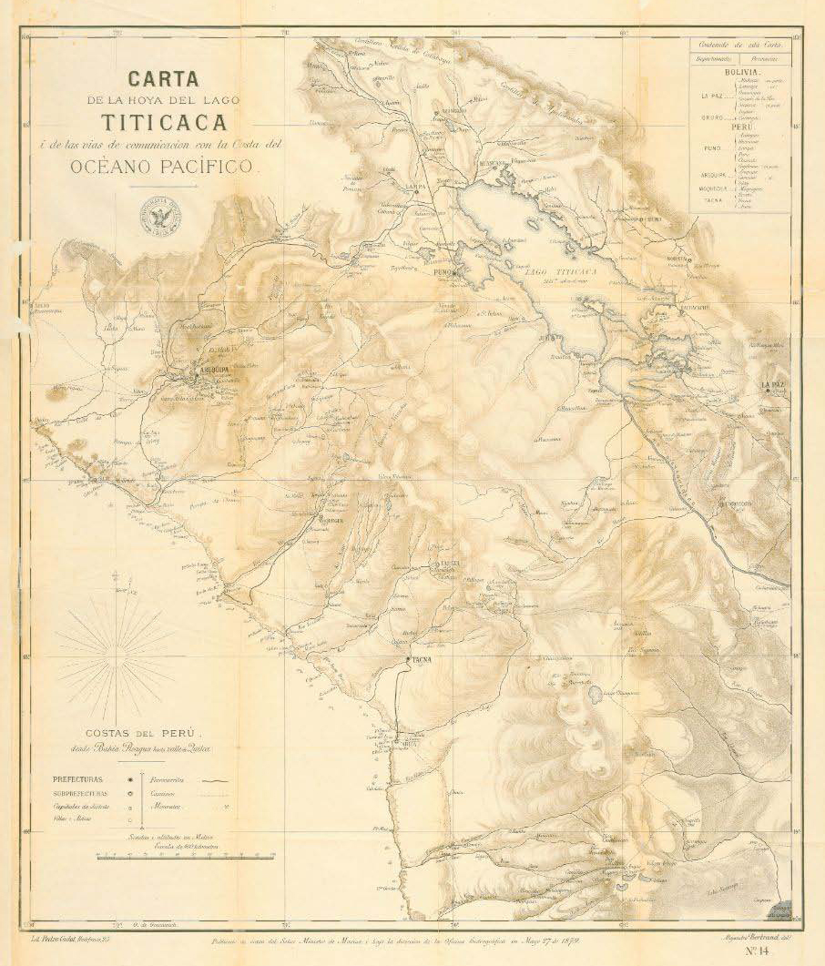 Mapa de la costa del sur peruano y de la hoya del Lago Titicaca. Es una carta geográfica del territorio comprendido entre los paralelos 14º 30’ y 19º 30. Fue elaborado por la Oficina Hidrográfica de Chile y publicada en Santiago el 15 de mayo de 1879.