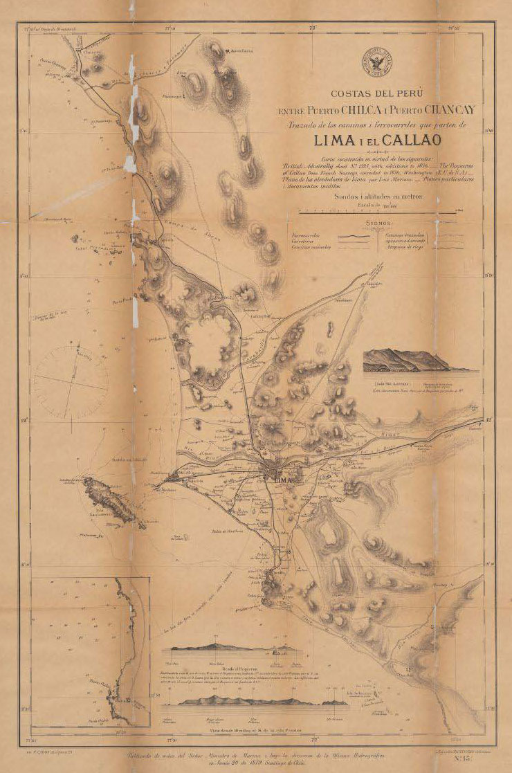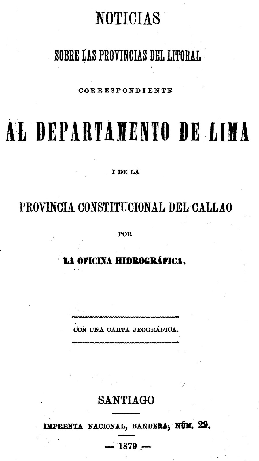 Oficina Hidrográfica de Chile. “Noticias sobre las Provincias del Litoral correspondiente al Departamento de Lima y de la Provincia Constitucional del Callao (Con una carta geográfica)”. Santiago de Chile, 5 de mayo de 1879, Imprenta Nacional. 75 páginas. Incluye una carta geográfica de la costa del departamento de Lima y la Provincia Constitucional del Callao.