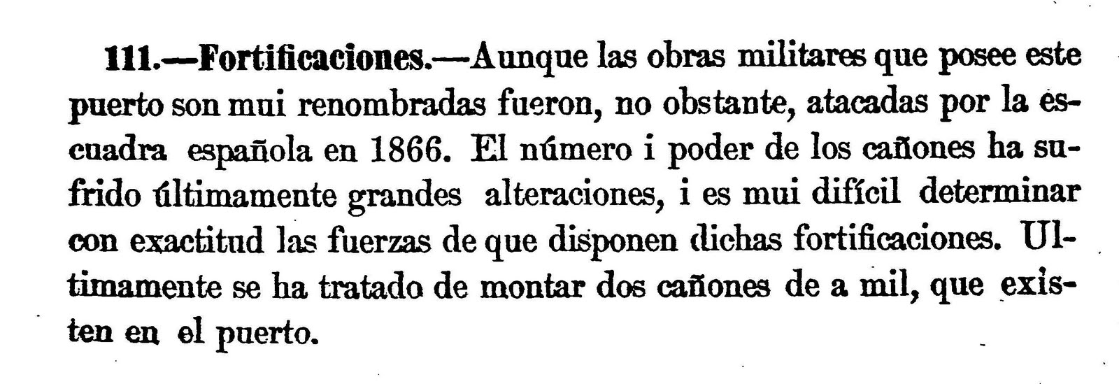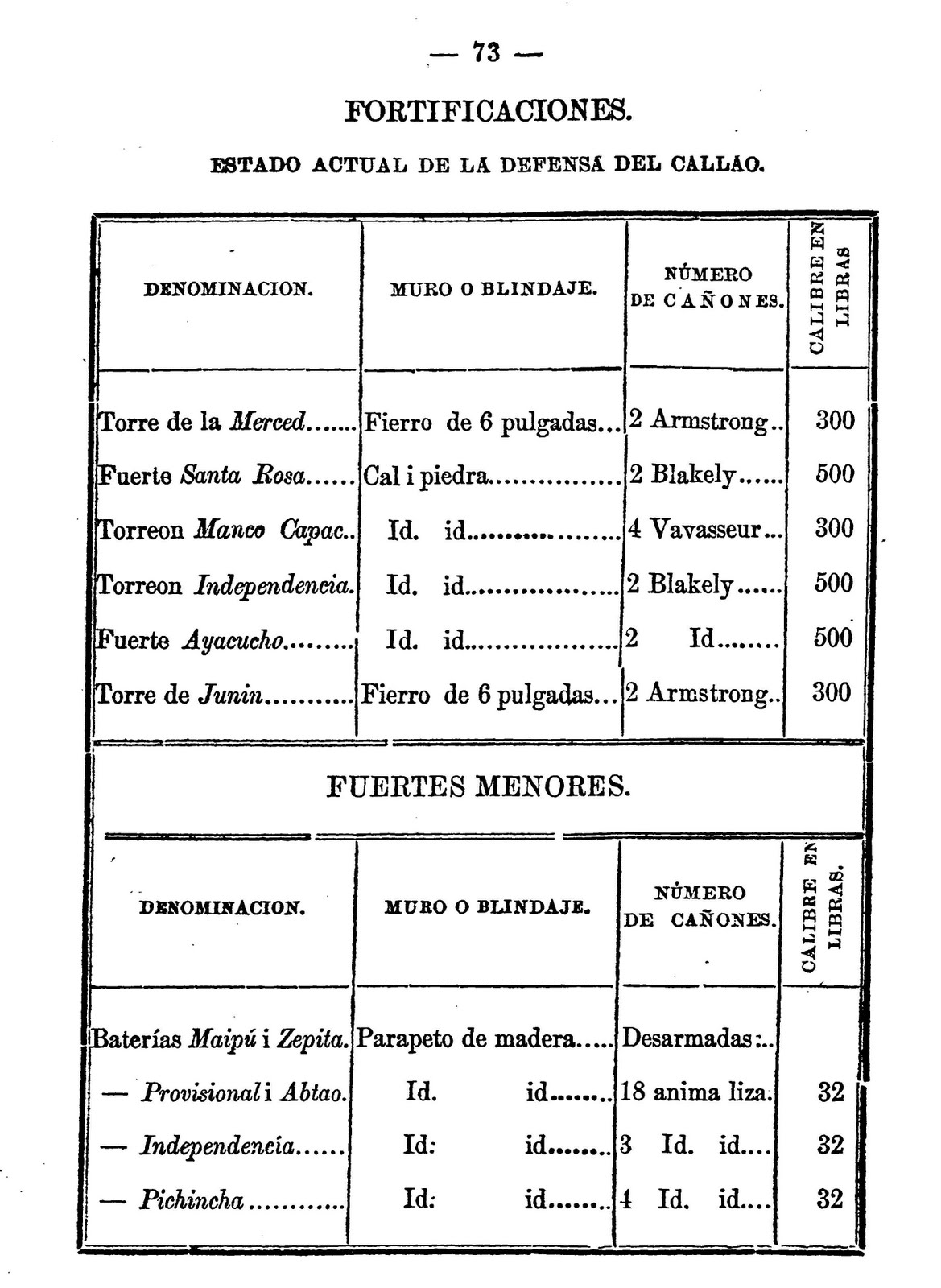 Podrá usted constatar en las siguientes imágenes que nuestrossiempre leales vecinos del sur contaban, por ejemplo, con una descripción de las fortificaciones del Callao en cada uno de sus fuertes, torres, torreones y baterías, con indicación del número de cañones y de su calibre en libras. En el opúsculo también se deja constancia del tipo de muro o blindaje (en pulgadas) de las fortificaciones chalacas.