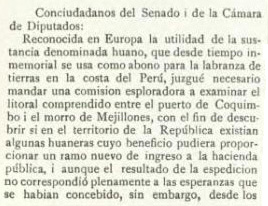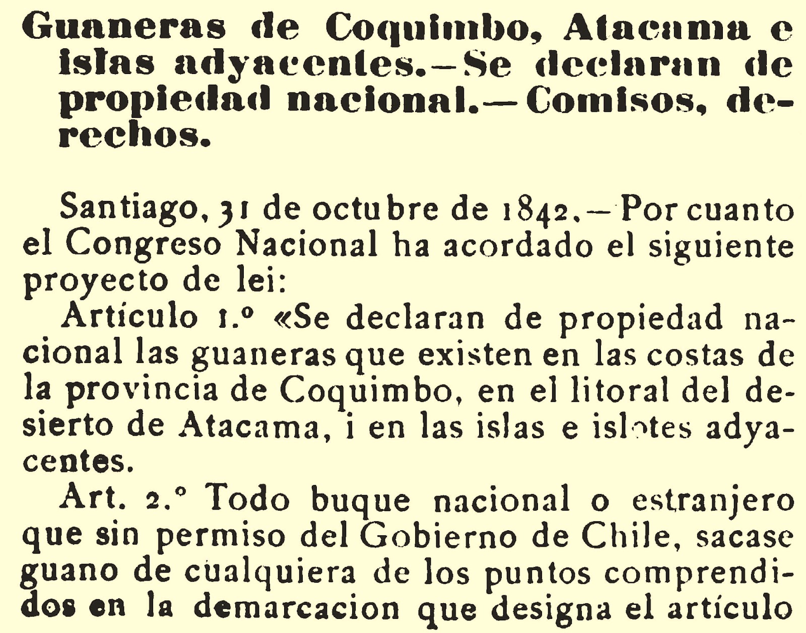 “Artículo primero. – Se declaran de propiedad nacional las guaneras que existen en las costas de la provincia de Coquimbo, en el litoral del desierto de Atacama, y en las islas e islotes adyacentes.
