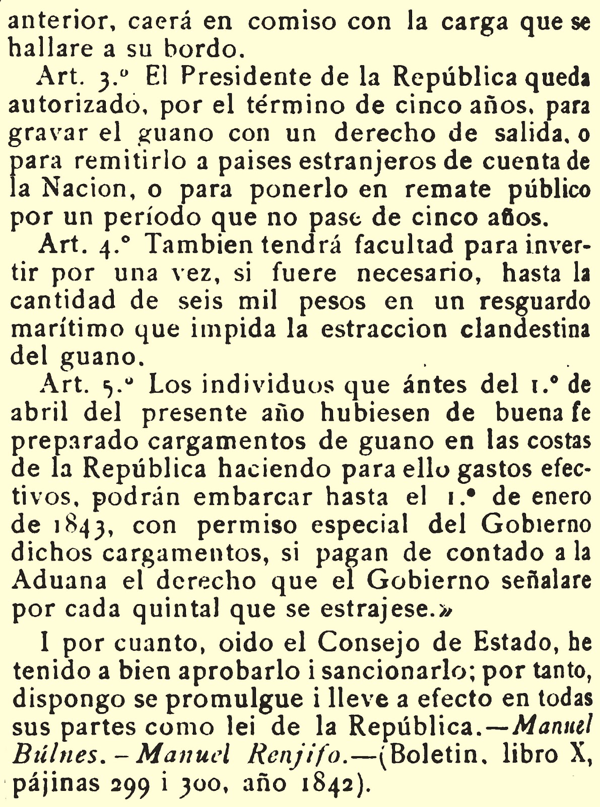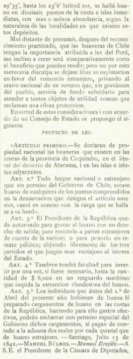 Art. 5. º Los individuos que antes del primero de abril del presente año hubiesen de buena fe preparado cargamentos de guano en las costas de la República, haciendo para ello gastos efectivos, podrán embarcar con permiso especial del Gobierno dichos cargamentos, si pagan de contado a la Aduana dos reales por cada quintal que de guano extrajesen”. – Santiago, julio 13 de 1842. – Manuel Bulnes. – Manuel Rengifo. – A S. E. el Presidente de la Cámara de Diputados.