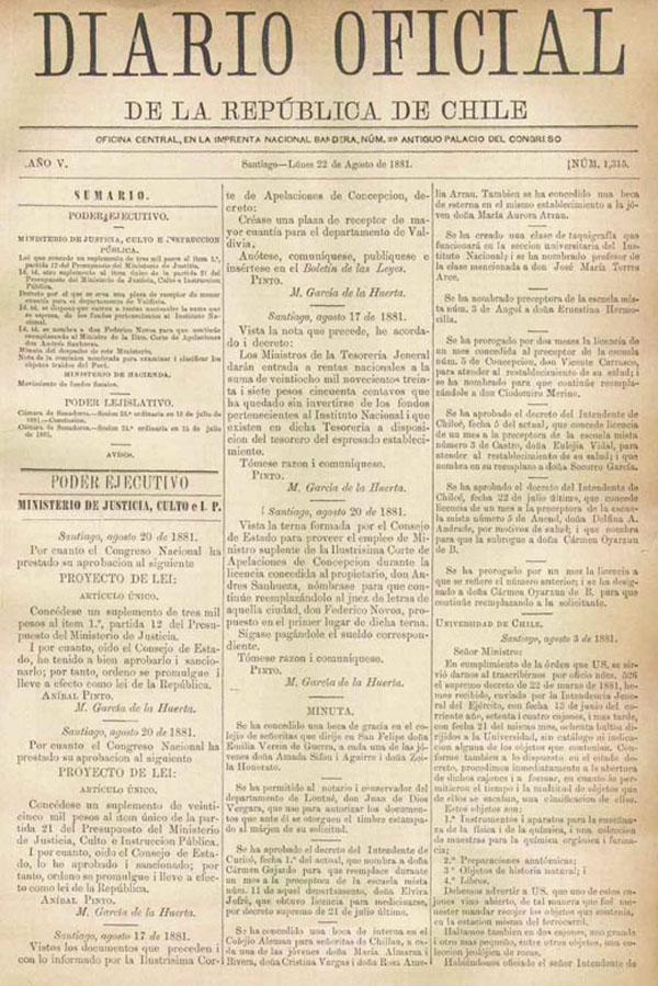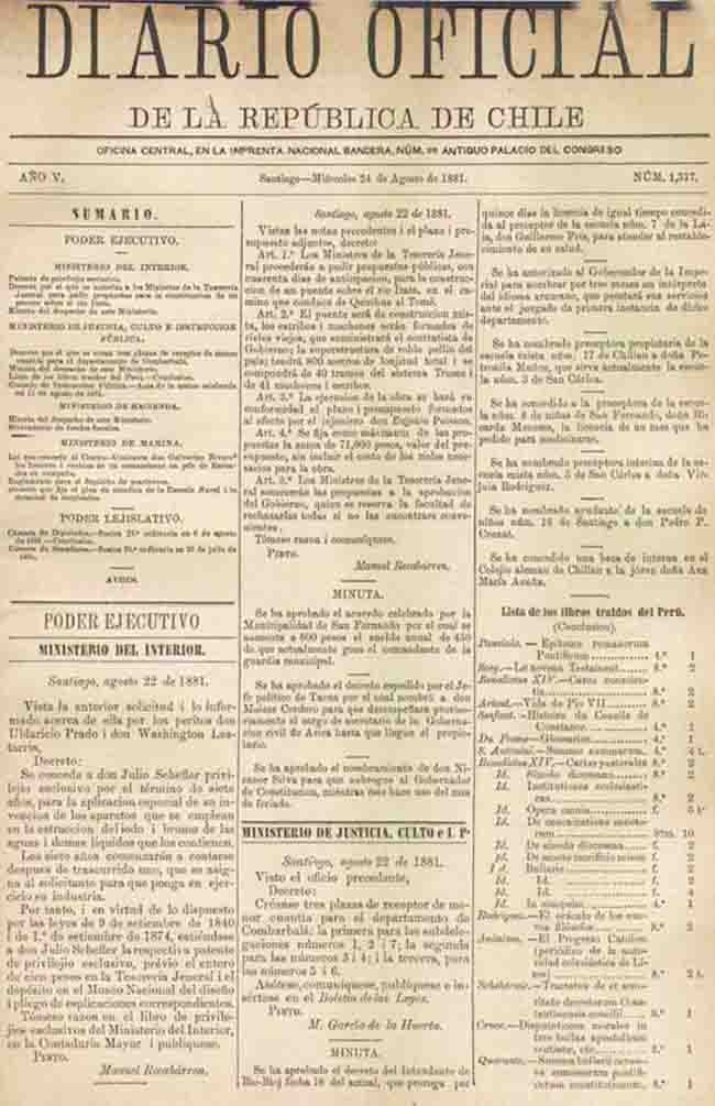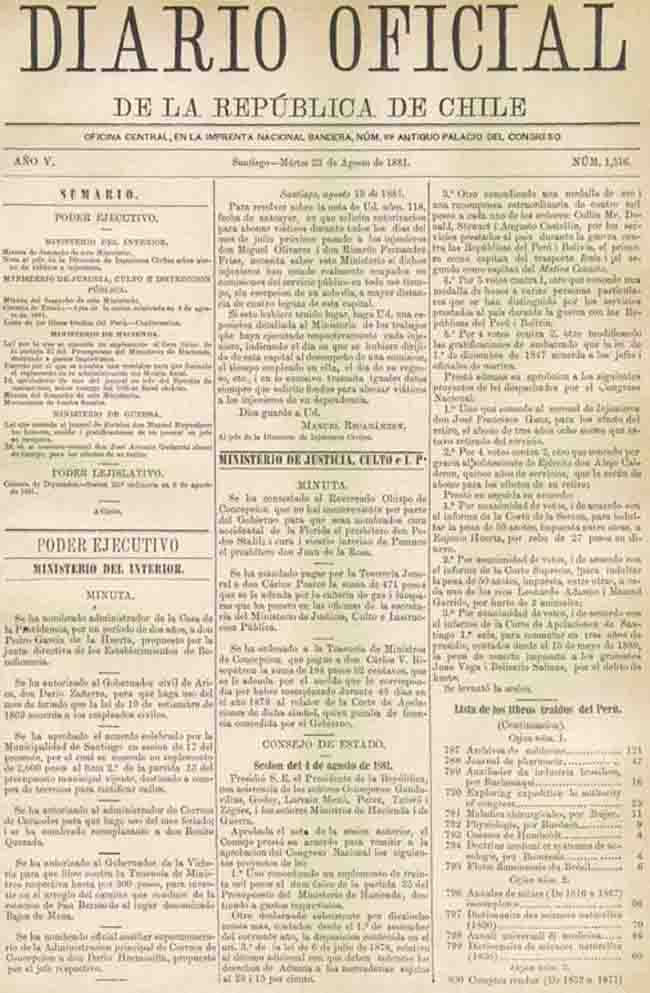 Diario Oficial de la República de Chile, Santiago, Sumario, lunes 22 de agosto de 1881, Año V, número 1,315.