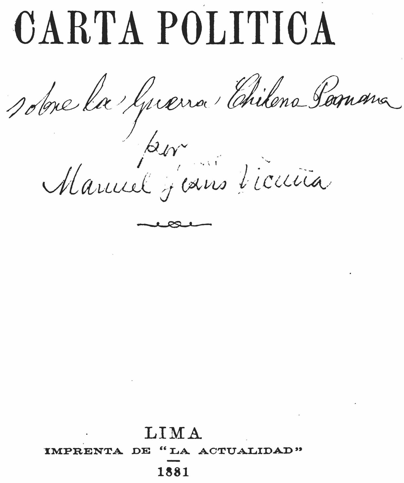 Vicuña, Manuel Jesús. Abril de 1881. Carta Política [sobre la Guerra Chileno-Peruana]. Lima: Imprenta de “La Actualidad”, páginas 117-125.