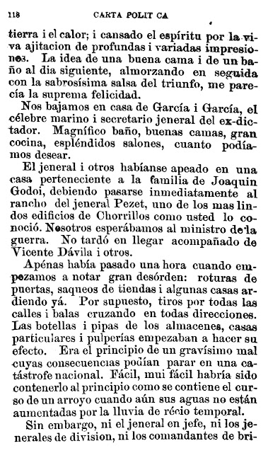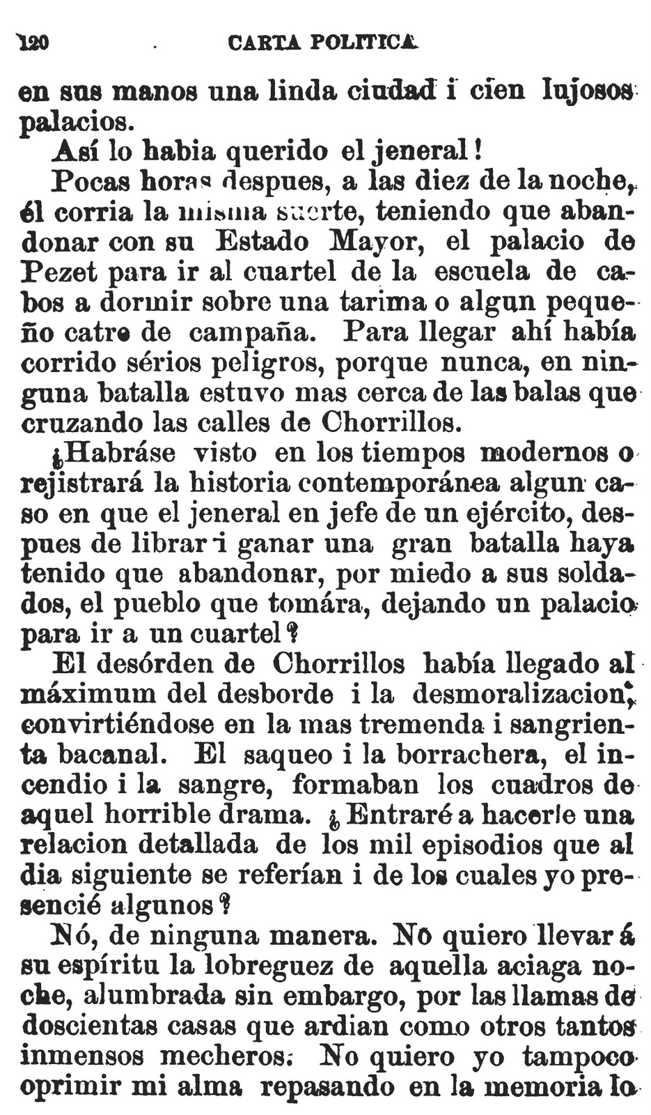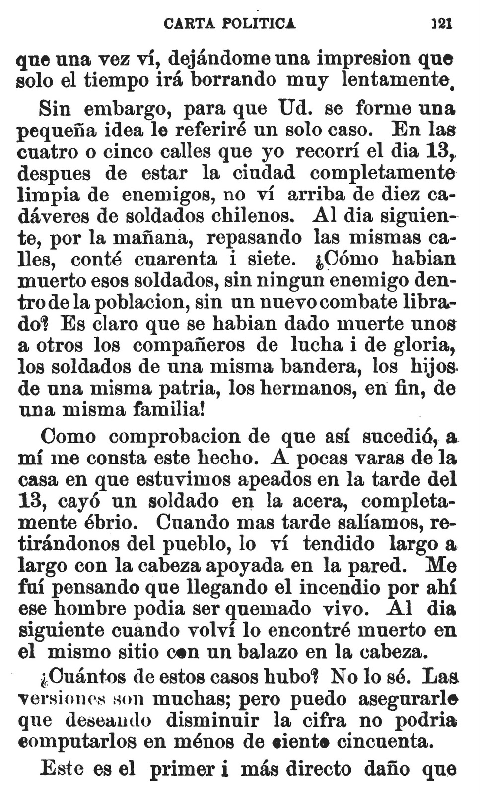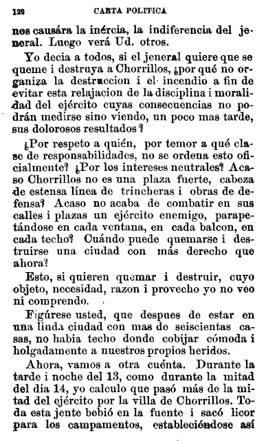 “Yo decía a todos, si el general [Baquedano] quiere que se queme y destruya a Chorrillos, ¿por qué no organiza la destrucción y el incendio a fin de evitar esta relajación de la disciplina y moralidad del ejército cuyas consecuencias no podrán medirse sino viendo, un poco más tarde, sus dolorosos resultados?¿Por respeto a quién, por temor a qué clase de responsabilidades, no se ordena esto oficialmente? ¿Por los intereses neutrales?”