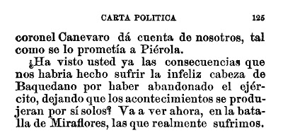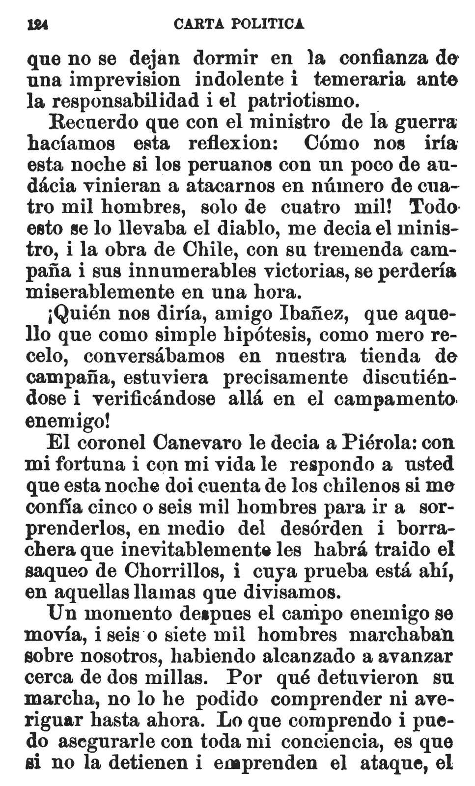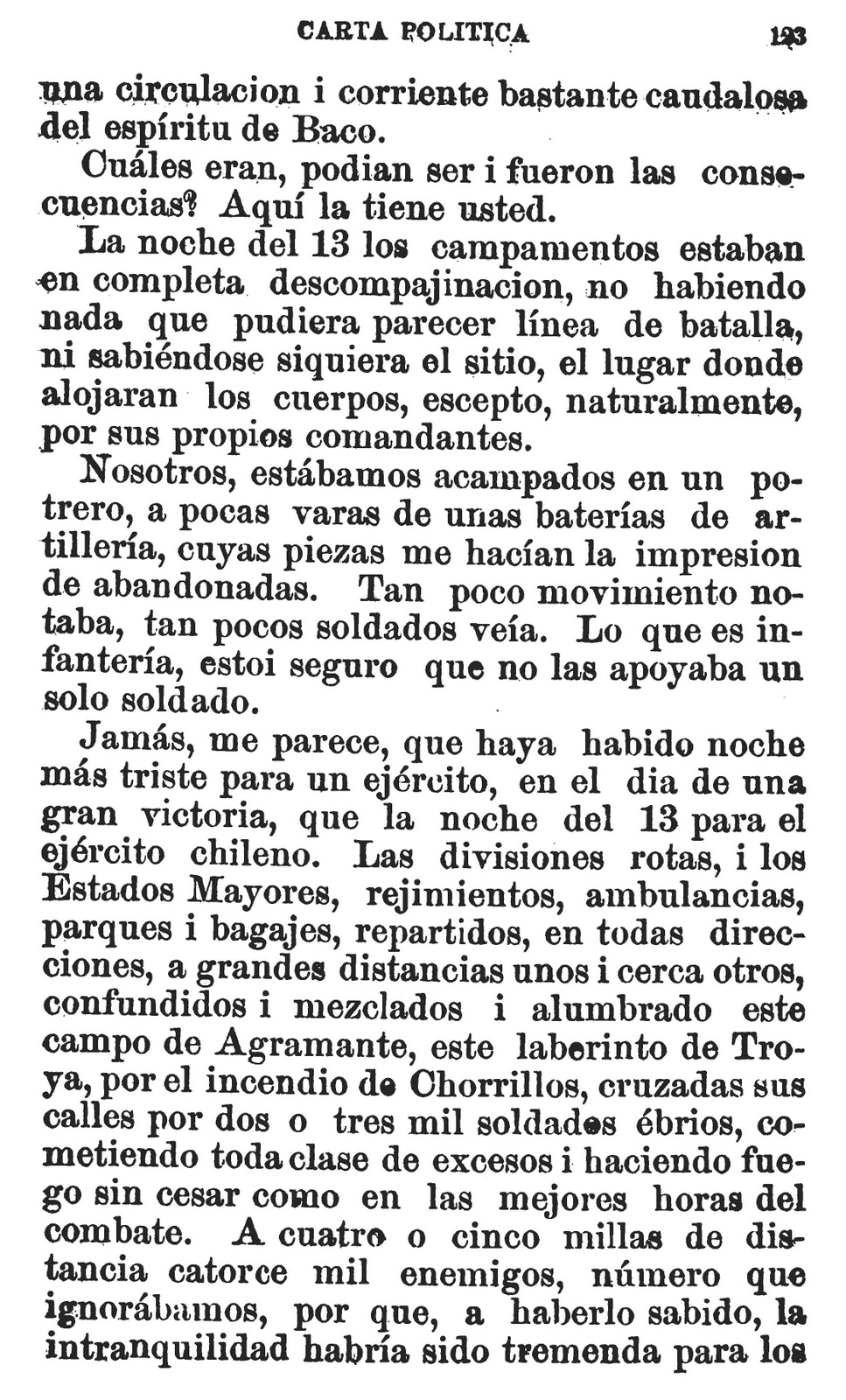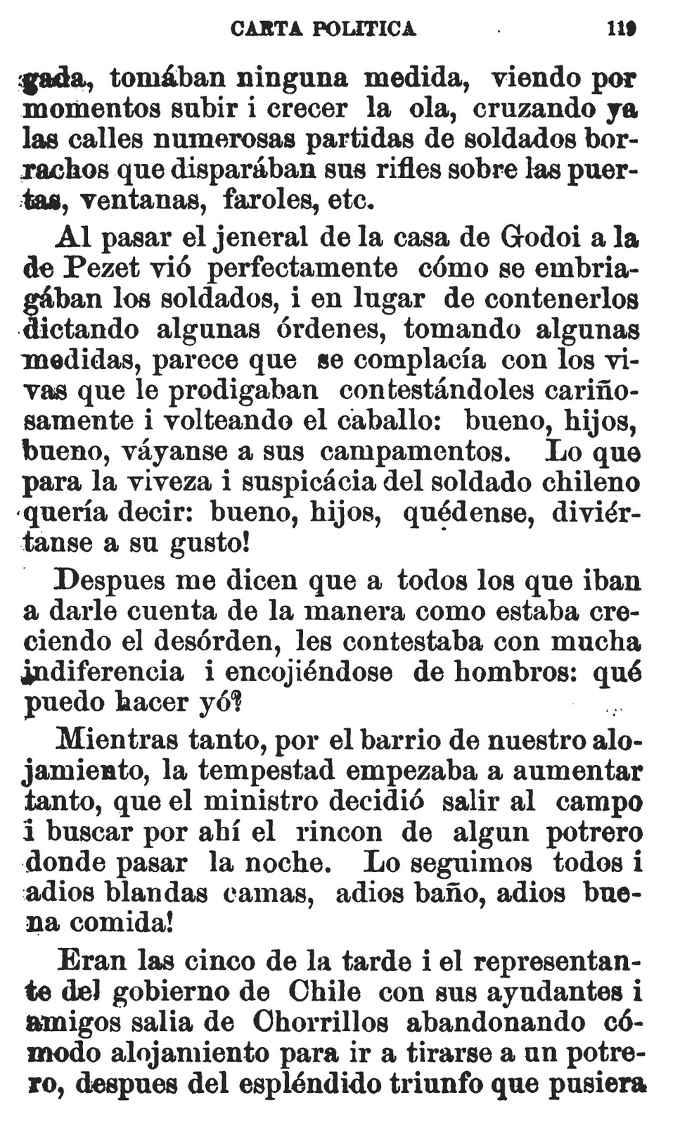“Yo decía a todos, si el general [Baquedano] quiere que se queme y destruya a Chorrillos, ¿por qué no organiza la destrucción y el incendio a fin de evitar esta relajación de la disciplina y moralidad del ejército cuyas consecuencias no podrán medirse sino viendo, un poco más tarde, sus dolorosos resultados?¿Por respeto a quién, por temor a qué clase de responsabilidades, no se ordena esto oficialmente? ¿Por los intereses neutrales?”