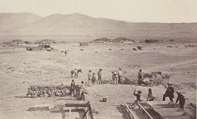Construcción de nueva oficina salitrera cerca de Iquique, Tarapacá, 1863.