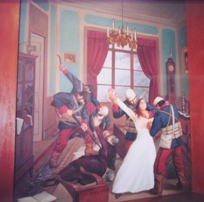 | Chilenos atacan famila en Chorrillos. Óleo: Etna Velarde |