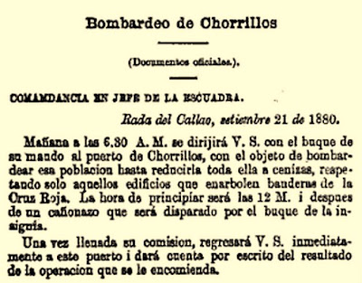 Orden oficial del criminal de guerra chileno Galvarino Riveros Cárdenas para bombardear la población de Chorrillos “hasta reducirla toda ella a cenizas”.