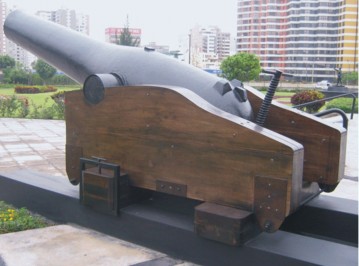 | Cañón Dahlgren que estuvo en la batalla de Miraflores y volado después por la caballería chilena. Encontrado en una construcción en Miraflores en el 2009, fue restaurado por la Brigada Naval y actualmente se exhibe en el parque Reducto. |