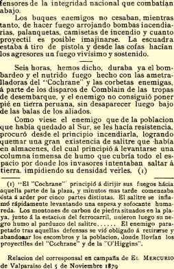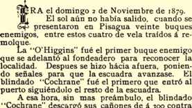 20 buques y 10 mil efectivos chilenos atacan puerto de Pisagua desde la madrugada de hoy.- A las 6 y 30 a.m. del domingo 2 de noviembre de 1879, incesante cañoneo de genocidas del sur sobre ciudad peruana no fortificada.- Población civil sufre estragos del ataque. 44 lanchas chilenas intentan tomar Pisagua.- En combate de siete horas, peruanos y bolivianos rechazan en tres ocasiones a los asaltantes del sur.- Soldadesca sureña se emborrachó para adquirir valor antes del asalto.- Asaltantes incendian Pisagua.- Chile: Enemigo a muerte del Perú