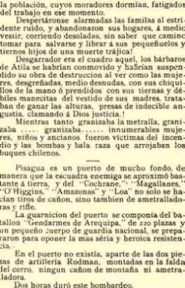 "sobre ciudad peruana no fortificada.- Población civil sufre estragos del ataque." y despues muestran los cañones que estaban instalados en Pisagua