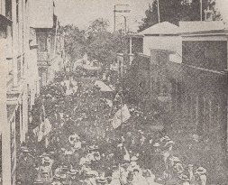 Y pasó la bandera y detrás de ella, como enorme escolta, avanzó el pueblo entero, y aquella procesión sin músicas ni aclamaciones —siempre en silencio, siempre majestuosa— recorrió, imponiendo respeto, y casi miedo, los jirones más céntricos de la ciudad cautiva.