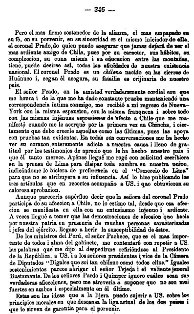 En particular, Mariano Ignacio Prado confiesa a Vicuña Mackenna que la familia Prado es originaria de Chile. La declaración no sorprende a Vicuña quien añade: “El coronel Prado es un chileno nacido en las sierras de Huánuco… Jamás dejará de ser el más ardiente amigo de Chile por su carácter, su cuna misma, sus hábitos, su complexión…” Vicuña recalca además “las ingenuas expresiones de afecto a Chile” pronunciadas por el traidor de 1879.