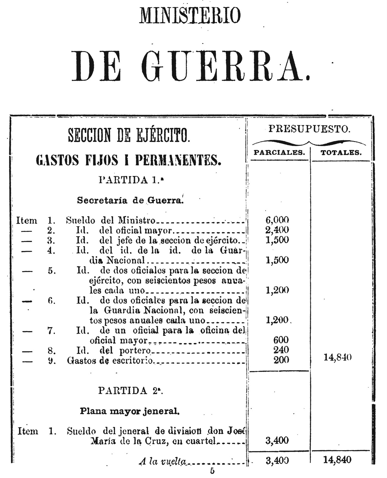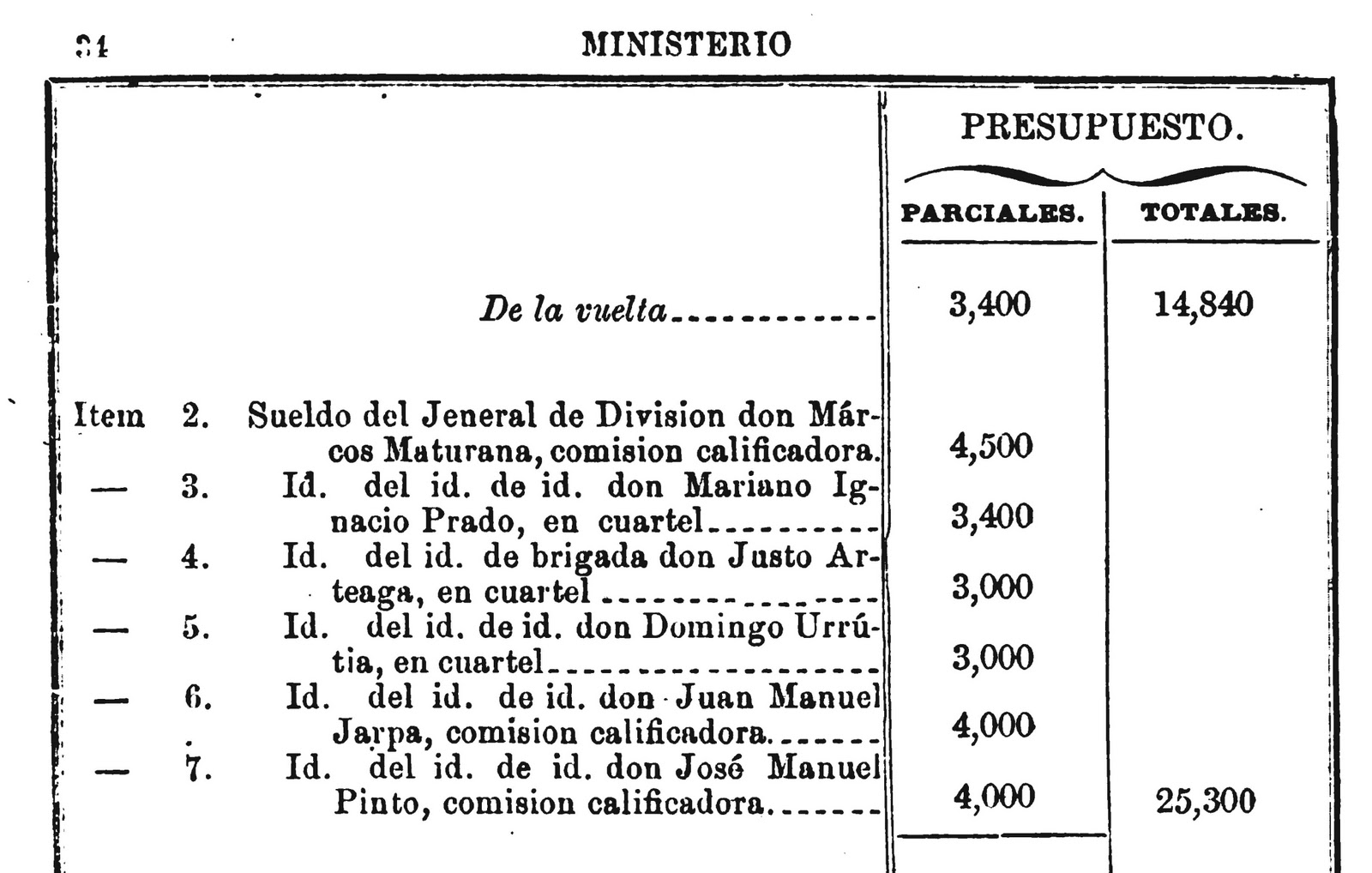 Lei de Presupuestos de los Gastos Jenerales de la Administración Pública de Chile para el año de 1870. Santiago de Chile: Imprenta Nacional, Presupuesto del Ministerio de Guerra, página 34.