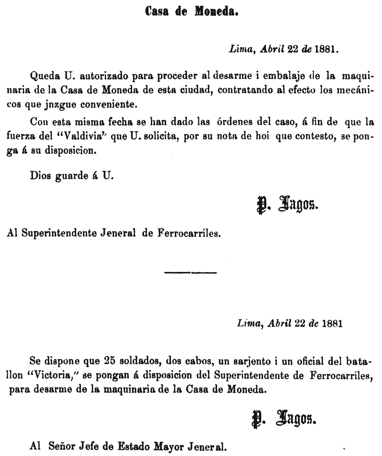 A continuación puede usted leer los dos decretos autorizando el atraco, ambos firmados por Lagos Marchant. En cumplimiento de los edictos, uniformados chilenos del batallón Victoria robaron la maquinaria de la Casa de la Moneda de Lima y la remitieron a Santiago de Chile.