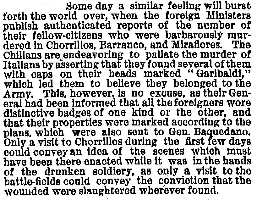 Además, los embajadores de las naciones europeas denunciaron la matanza de extranjeros y el saqueo de sus propiedades. El New York Times recogió la protesta por el “bárbaro asesinato de numerosos extranjeros” cometido por los criminales de guerra chilenos en Chorrillos, Barranco y Miraflores.