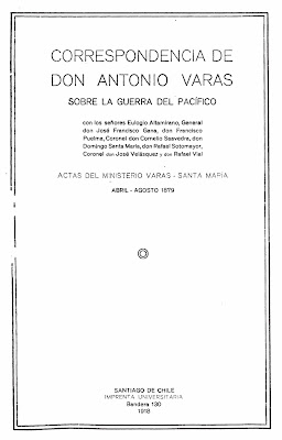 Varas, Antonio. 1918. Correspondencia de don Antonio Varas sobre la Guerra del Pacífico. Actas del Ministerio Varas – Santa María. Abril-Agosto 1879. Santiago de Chile: Imprenta Universitaria, páginas 251-252.
