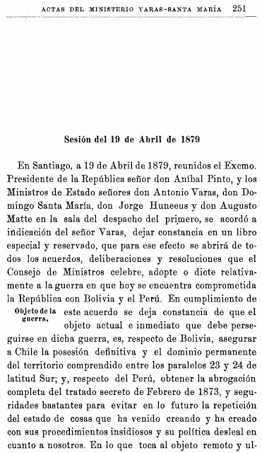 “En lo que toca al objeto remoto y ulterior que en la guerra puede proponerse alcanzar el Gobierno de Chile, aunque no ha entrado en las miras de éste ensanchar el territorio de la República con adquisición del ajeno, ni ha sido ni es su propósito asumir el carácter de conquistador, el señor Presidente y Ministros fueron de opinión que ese objeto puede modificarse sensiblemente, según el rumbo que tomen los sucesos. Así, un golpe serio dado a la armada peruana; la segregación de Bolivia de la alianza con el Perú para colocarse a nuestro lado en el actual conflicto, serían causa que podrían modificar los propósitos actuales del Gobierno, poniéndole quizás en el caso de perseguir como resultado de la guerra, alteraciones en los límites del Perú, que asegurando por completo la tranquilidad de la República, imposibilitaren a aquella Nación para ser una amenaza contra el equilibrio Sudamericano” (Varas 1918, pp. 251-252).